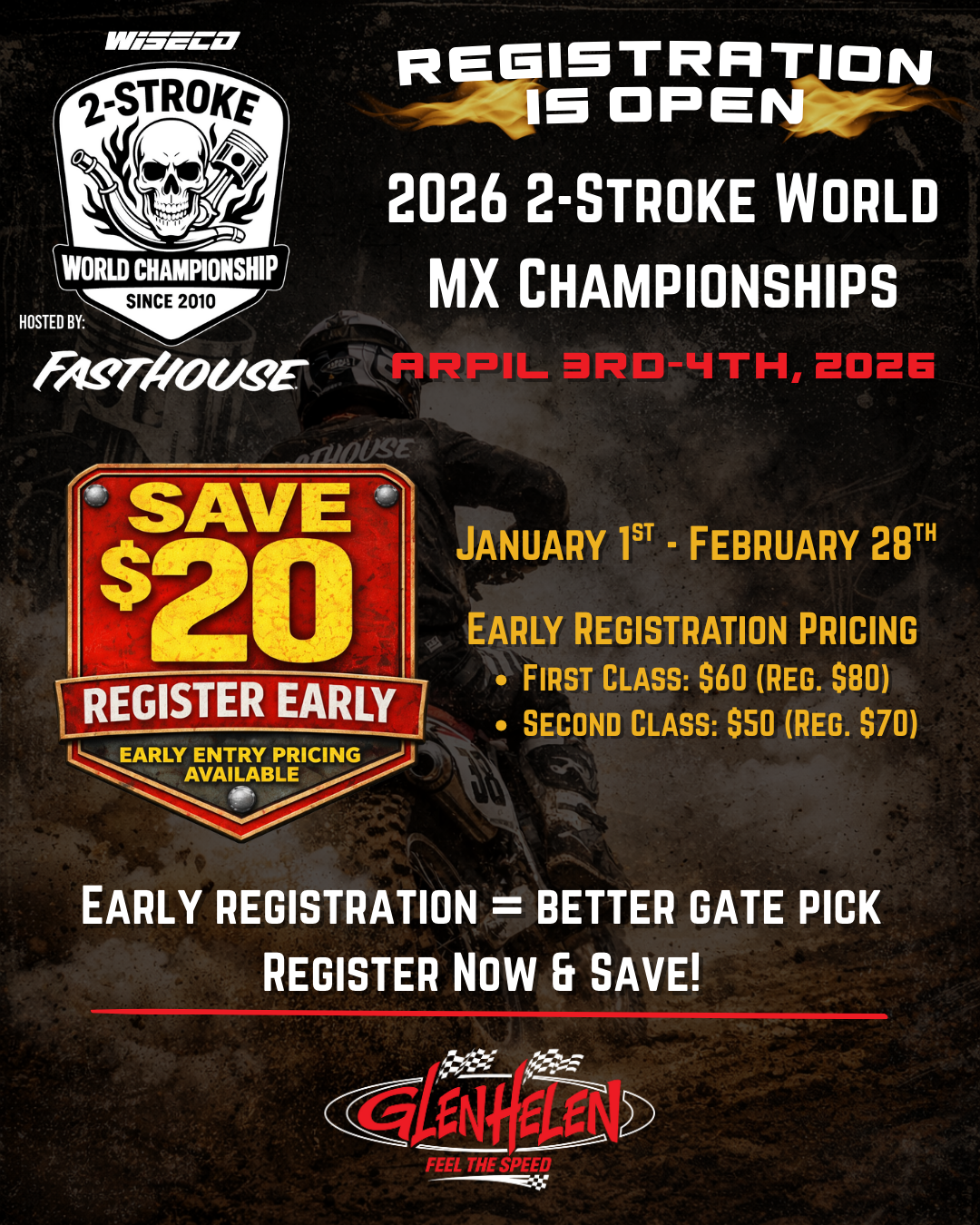 Registration is officially open for the 17th Annual Wiseco 2-Stroke World MX Championships, hosted by Fasthouse at Glen Helen Raceway.